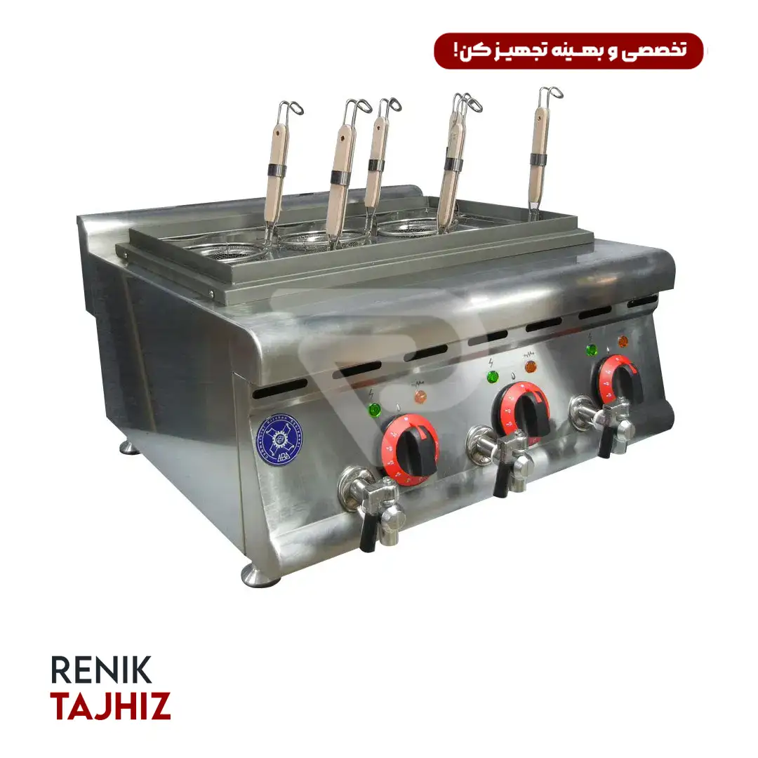 این دستگاه پاستاپز صنعتی یک واحد رومیزی برقی است که دارای 6 سبد استیل با ظرفیت 1 کیلوگرم برای هر سبد می‌باشد. طراحی فشرده آن با ابعاد 60×60×35 سانتی‌متر، آن را برای قرارگیری روی پیشخوان رستوران‌ها و مراکز تهیه غذا ایده‌آل می‌کند. این دستگاه با برق 220 ولت و قدرت 6 کیلووات کار می‌کند و دارای سه ترموستات مجزا است که هر کدام دو سبد را برای کنترل دقیق دما کنترل می‌کند.
