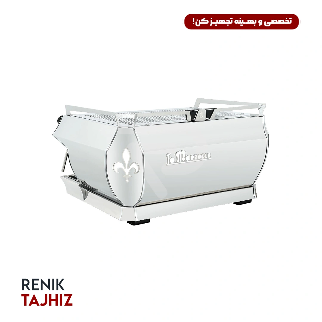 La Marzocco GB5 X با خطوط ظریف، لعاب براق استیل و گلهای سوسن سفید در کنار لوگوی سفیدش، هویتی خاص در میان ماشینهای اسپرسو دارد.